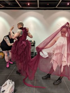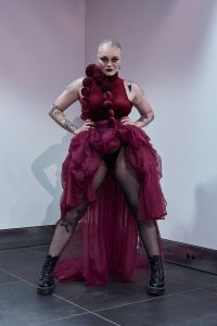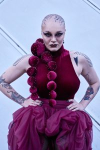 Blood red garment – Designed & made by Angelique Joy after the Love Lies Bleeding flower. Modeled by Daisy.