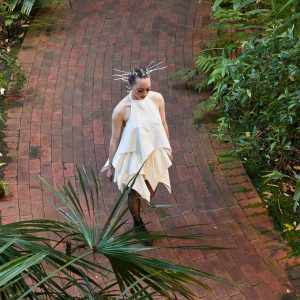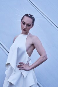 White garment – Designed by Brent Leideritz after the Brugmansia Flower. Made by Angelique Joy, Modeled by Felicity.